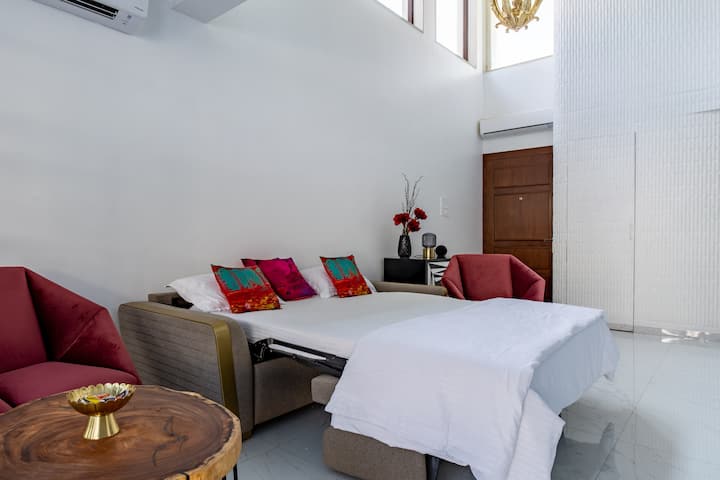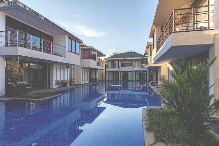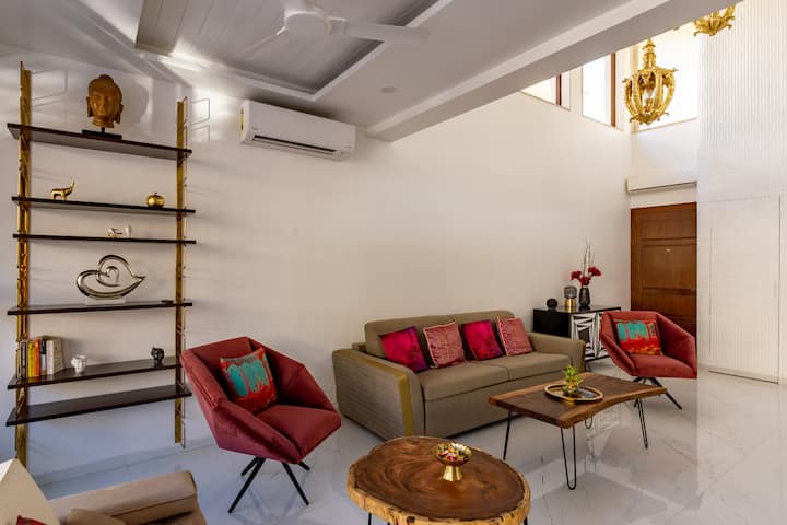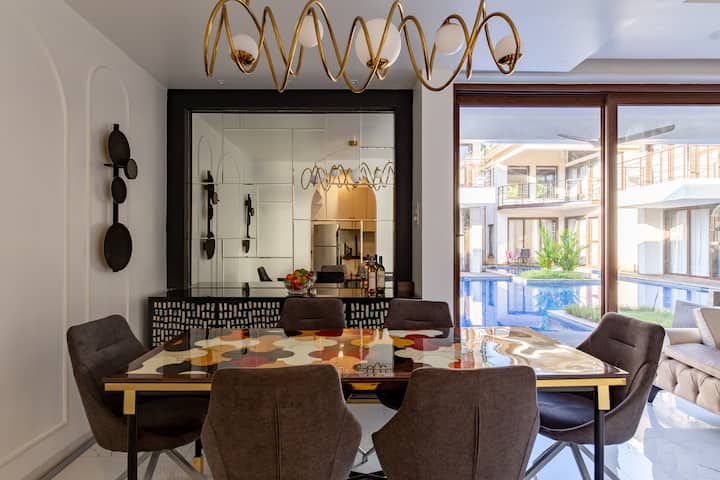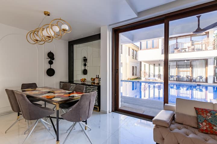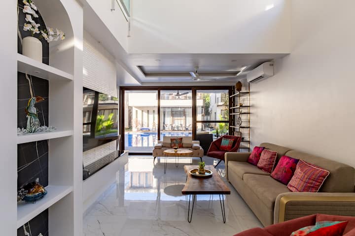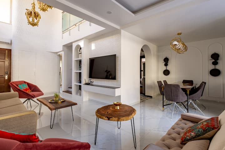 The name says it all: Aqua (Water) + Sol (Sun). AquaSol is a celebration of the tropical summer. This 3BHK villa is vibrant, energetic, and enveloped in greenery. It ditches the “corporate luxury” look for something much more fun and organic. Expect lush plants bordering the pool, bright tropical prints on the upholstery, and a vibe that screams “Vacation.” It is the perfect hideaway for families or friends who want to feel like they are staying in a private tropical resort rather than a standard house.